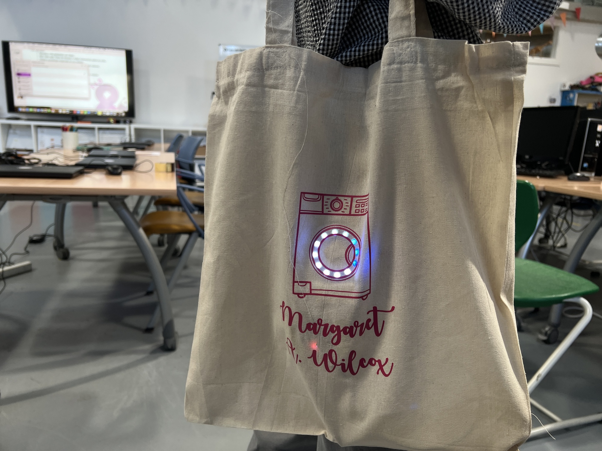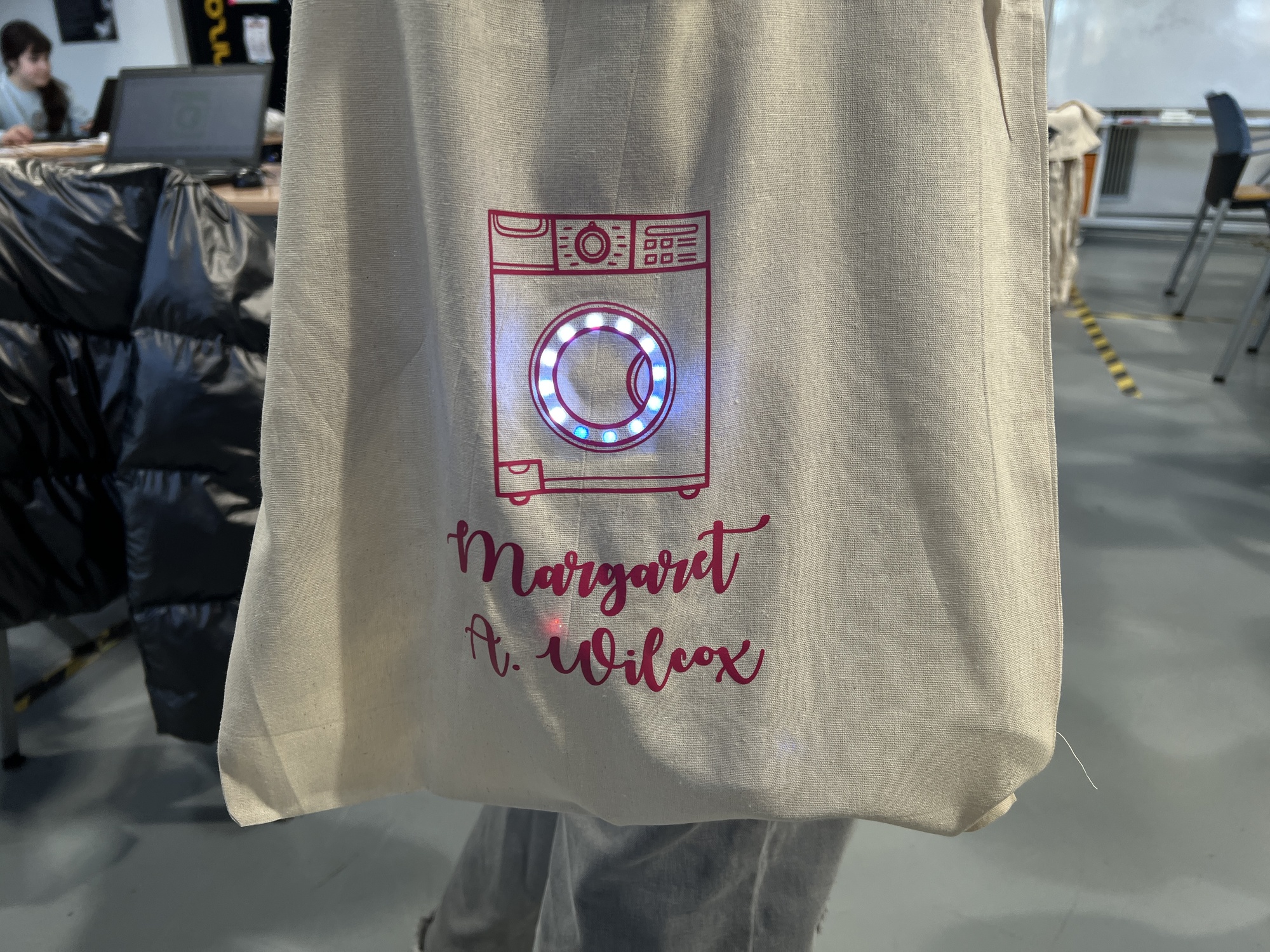 🛠️ They designed a custom vinyl tote bag featuring a washing machine illustration and integrated a FabriXiao with a neopixel ring to replicate the circular motion of the washing drum 🔄💡