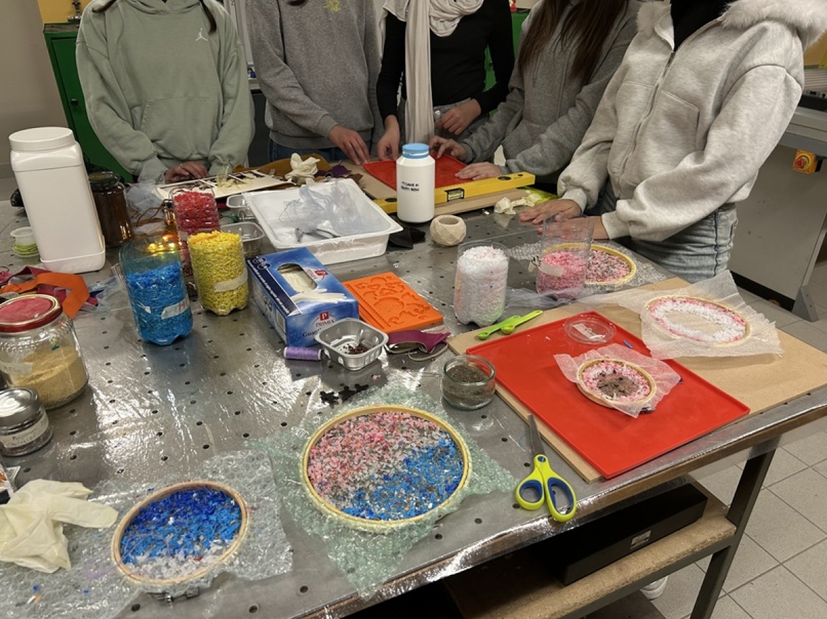 - We also experimented with biomaterials: students cast agar-agar into embroidery hoops, embedding colored plastic granules, LEDs, and food-waste powders to create decorative bio-composites.