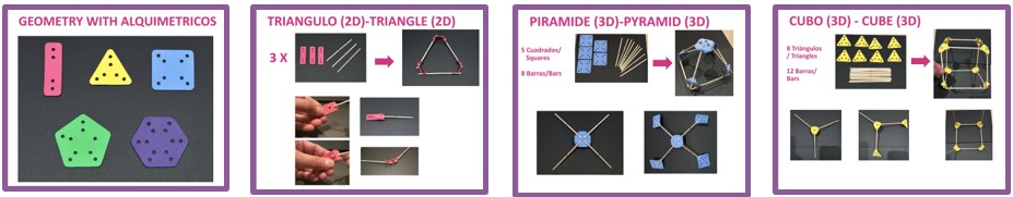 Hands-on: (20 minutes) Hands-on Construction of different 2D and 3D objects (Triangle, Octahedron, Pyramid, Cube) using alquimetricos modules.